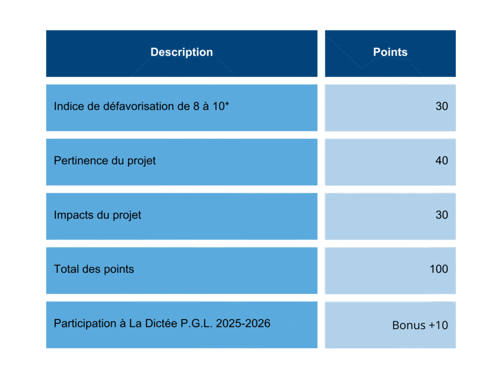 *Les écoles avec un indice de défavorisation inférieur à 8, selon l’indice de milieu socio-économique (IMSE), récolteront 10 points au lieu de 30 points.